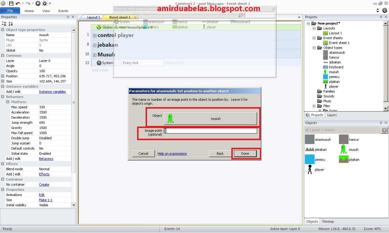 Pada bagian objek kalian pilih objek musuh dan pada bagian image point kalian masukkan angka 1, jika sudah kalian klik done, seperti gambar dibawah ini: